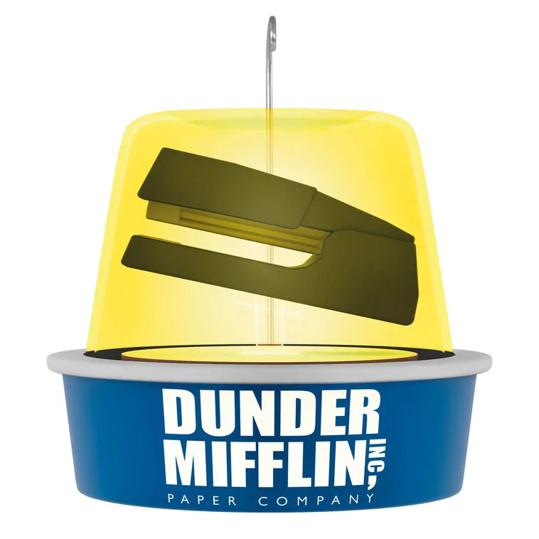 Adorn your tree with mischievous memories inspired by Jim's famous practical joke on Dwight. This funny Christmas tree ornament features a black stapler floating in a yellow gelatin mold with the iconic Dunder Mifflin logo, reminiscent of the classic prank scene from the TV show "The Office." Press the button to hear memorable dialogue.
