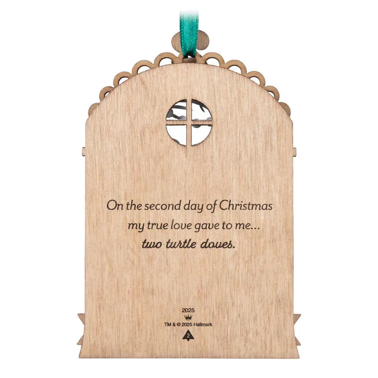 Celebrate a classic seasonal tradition with an exquisite ornament series representing each of the 12 days of Christmas. This Christmas tree ornament features a beautiful laser-cut wood frame that showcases an intricate papercraft scene depicting Two Turtle Doves. The back of the decoration includes a verse from the timeless song. 2nd in the Twelve Days of Christmas Keepsake Ornament series.