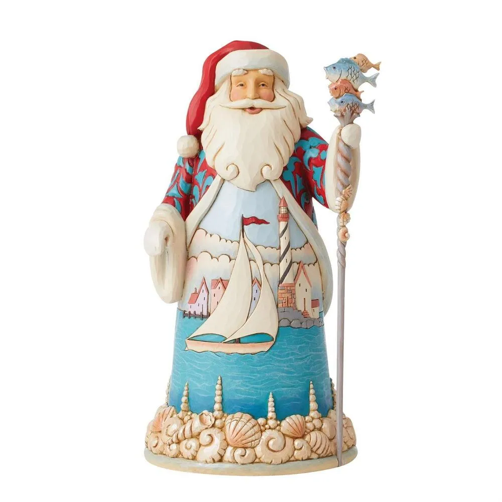 Santa wishes you a Merry Christmas from the coast. With a fish capped staff in hand and a sailboat scene upon his skirt, Santa can't help but enjoy the sea air. Adorned in shells and pearls, Santa sets sail.