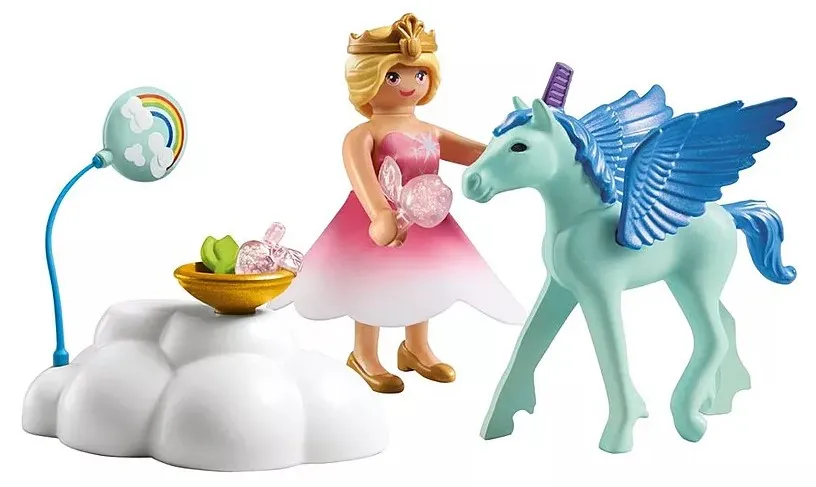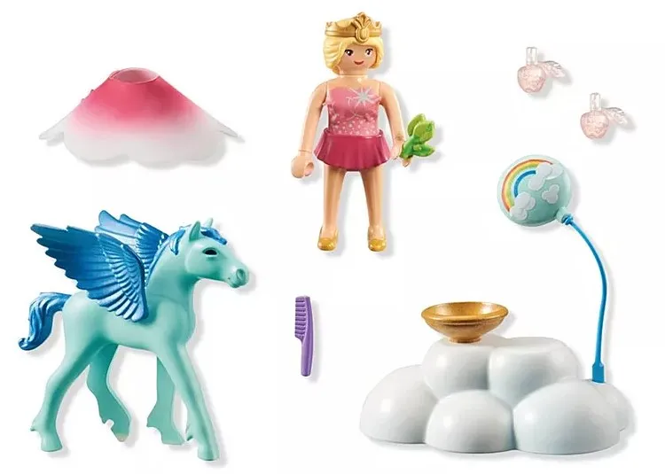Celebrate the birthday of the princess's sweet Pegasus foal together. This set promises a magical time: Comb the foal, feed it with apples, and let the princess hold the floating balloon. An unforgettable day for the Pegasus foal!