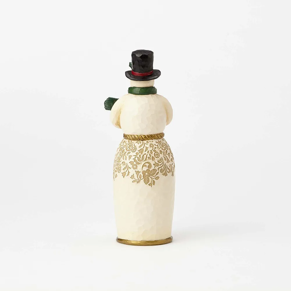 Festive with a touch of timeless elegance, the Golden Garland Snowman features intricate floral designs and burnished metallic detail. Wearing a holly-adorned top hat and winter scarf, he holds a cheerful cardinal friend.