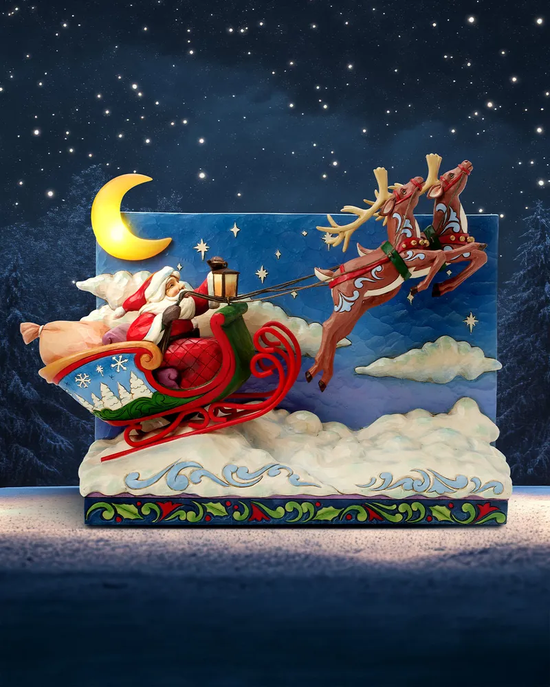 This stunning deluxe Jim Shore Santa scene lights up with LED to illuminate Santa's magical flight through the night sky with his reindeer. Guided by the moon, stars, and lantern, the reindeer soar to the tune of "Up On The House Top".