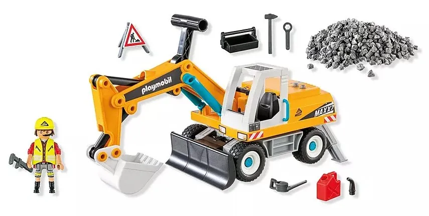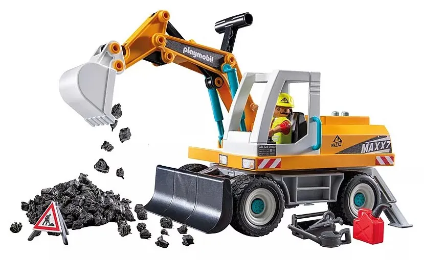 Set includes 1 man with construction helmet, 1 excavator with driver's cab, large shovel, support legs and shovel, 1 petrol can, 1 bulk material, 1 construction site equipment, 1 safety vest.