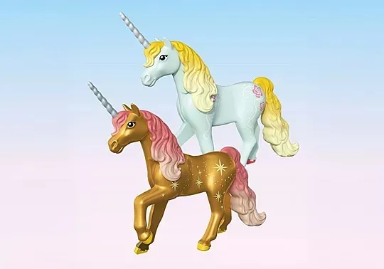 Let yourself be enchanted by the world of magical unicorns! Today, the fairy couple receive a visit from the golden unicorn in their charming little house. Together with their cute helpers, the joylings, the two fairies look after their new guest outside in the open stable. After an eventful day, the golden unicorn lies down to rest and the fairies also snuggle up in their cozy beds.