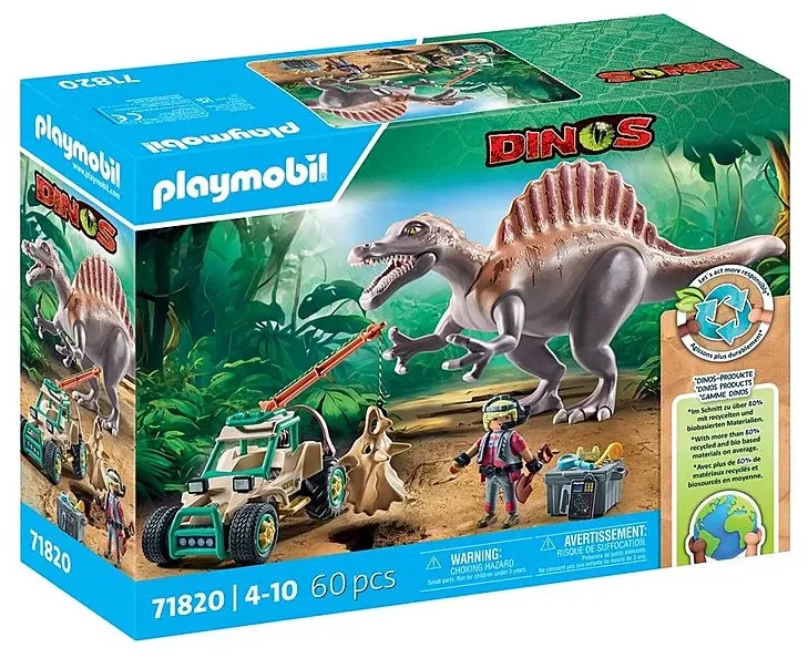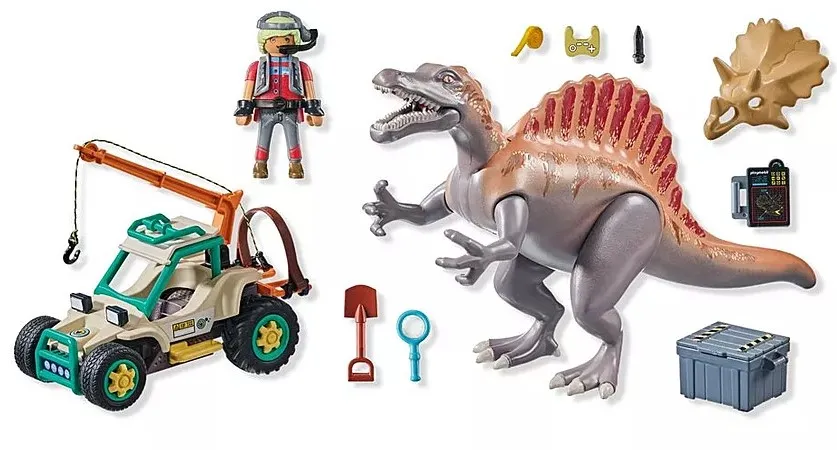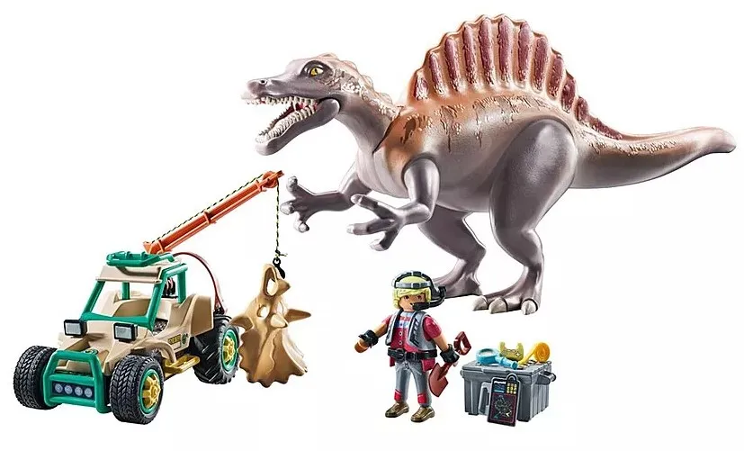 During an exciting excavation, the researcher comes across the dangerous Spinosaurus. The researcher's car provides the perfect escape from the aggressive dinosaur with its large, movable jaw. A swiveling crane on the cart allows the researcher to safely move a crate full of useful accessories. However, the main goal of the expedition is to recover the impressive skull of a Triceratops. Includes a dinosaur knowledge card.