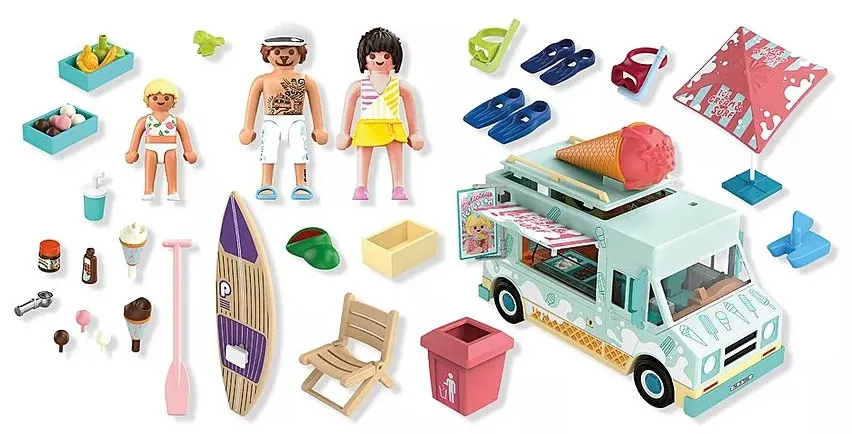 Set includes 1 woman, 1 man with cap, 1 girl, 1 bird, 1 truck with large ice cream cone on the roof, 1 ice cream counter with strawberry, chocolate and vanilla ice cream, 1 glass with lid, 1 tube, 1 drinking cup with straw, 2 ice cream cones with various plug-in ice cream scoops, 1 surfboard, 1 paddle, 2 flippers, 2 diving goggles with snorkel, 3 boxes of fruit, 1 parasol, 2 folding chairs, 1 waste paper basket, 1 play sailboat, 1 ice cream scoop dispenser.