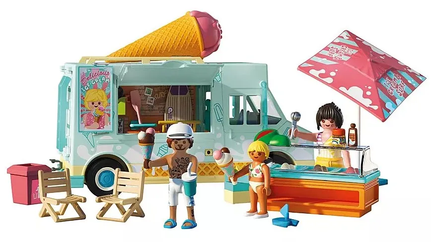 Summer fun on wheels! The PLAYMOBIL Ice Cream Truck with Surf Shop brings sweet treats and splashy adventures to the beach. With its retro design, removable roof, opening side flap, and rotating sign, this truck is packed with cool surprises. Kids can scoop and serve ice cream, then switch gears to rent out surfboards and snorkels. The detailed interior includes a removable counter, cone holders, and gear shelves. Whether relaxing under the parasol or diving into water sports, this colourful PLAYMOBIL set promises hours of imaginative beachside play!