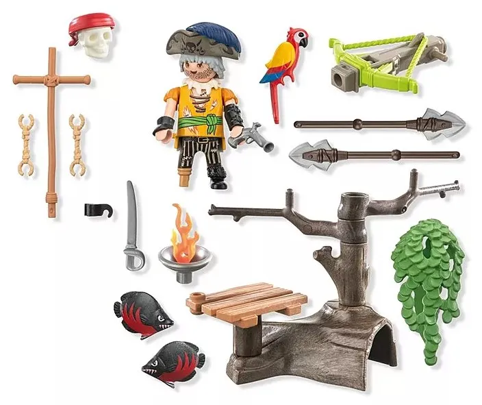 Set includes 1 pirate, 2 fish, 1 tree stump, 2 branches, 1 tree extension, 1 fire bowl with fire, 1 hanging plant, 1 pedestal, 1 wooden cross, 1 skull, 1 headband, 2 projectiles, 1 projectile holder, 1 ballista, 1 hat, 1 feather for hat, 1 pistol, 1 dagger, 1 clip, 2 arm cuffs.