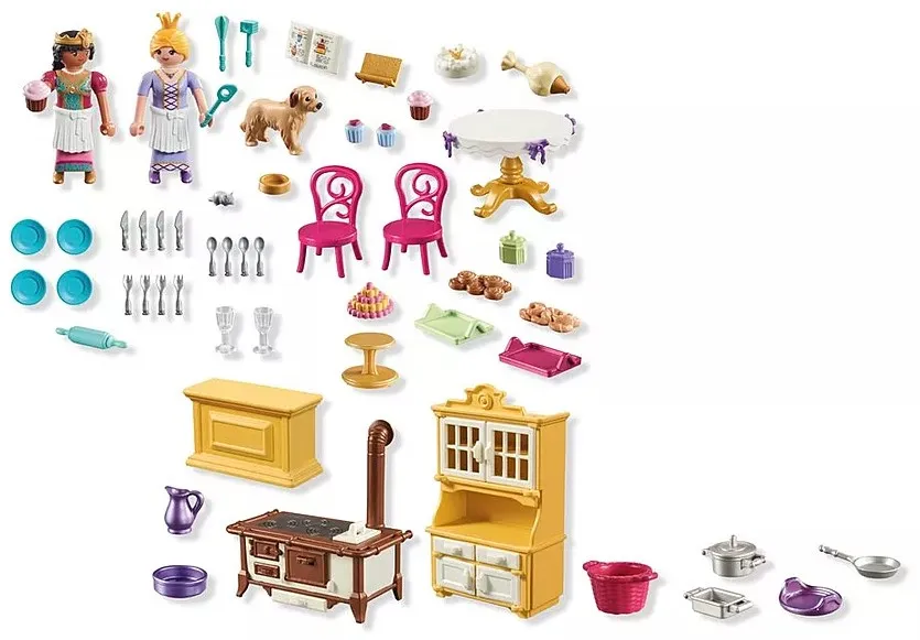 Set includes 2 princesses, 1 dog, 1 mouse, 2 crowns, 2 aprons, 1 table with bows, 2 chairs, 1 counter, 1 open cabinet, 1 stove, 1 basket, 1 piping bag, 1 cooking spoon, 1 whisk, 1 rolling pin, 1 meat tenderizer, 1 pan, 1 pot with lid, 1 roasting pan, 1 mouse, 1 tiered serving tray, 1 macaron cake, 4 muffins, 2 glasses, 1 book, 1 bookend, 1 carafe, 1 bowl, 2 rectangular trays, 1 oval tray, 1 cinnamon roll, 1 cake, 1 croissants, 2 sugar bowls, 4 plates, 4 forks, 4 knives, 4 spoons.