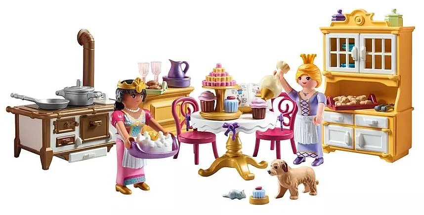 Delight in the elegant details of the royal kitchen where every accessoryfrom the tiered serving tray to the rolling pin and charming cookbookenhances the cooking adventure. The beautifully designed furniture and intricate decor add an authentic touch, making each baking session a memorable culinary journey. Immerse yourself in playful culinary adventures as the princesses experiment with recipes. The delightful set, complete with a sweet court dog and curious mouse, sparks imaginative storytelling and endless fun in a vibrant, magical kitchen. Every moment is a celebration of royal creativity and flavour.