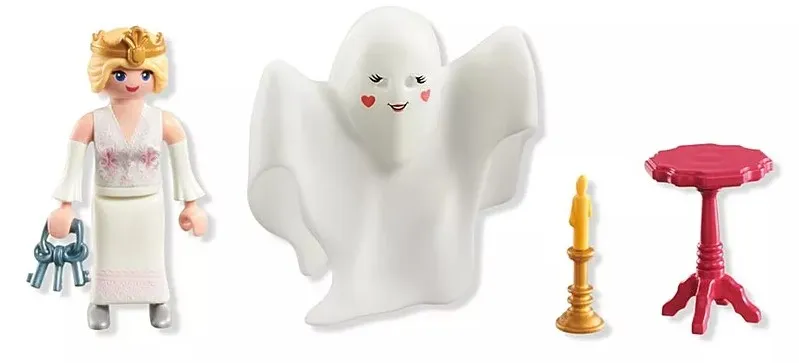 Set includes 1 princess, 1 crown, 1 ghost costume, 1 ghost hood, 1 table, 1 keychain, 1 candlestick, 1 candle.