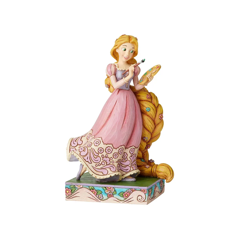 Rapunzel spends her days painting the world she longs to explore beyond her tower walls. Inspired to follow her dreams, she embarks on an adventure that leads her home. In this lively Jim Shore design, the Tangled princess happily paints with her artist's palette.