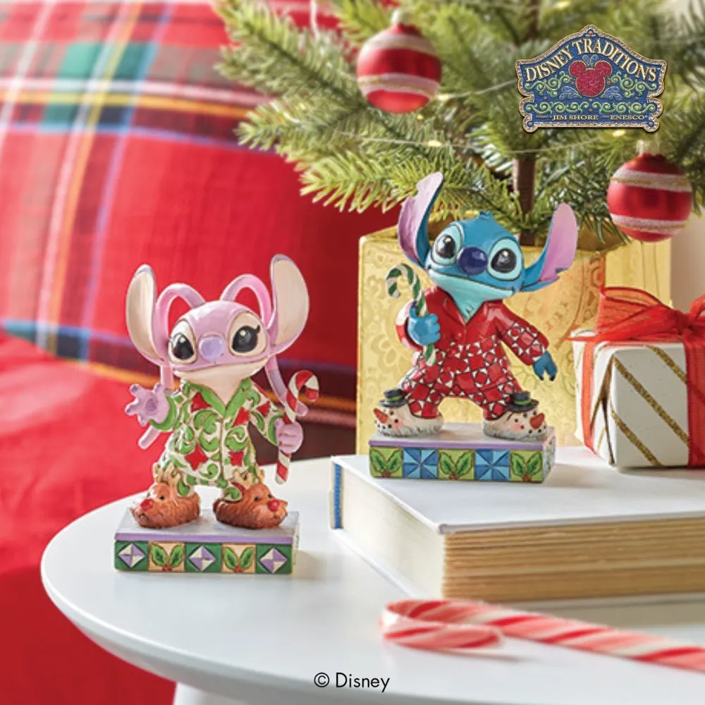 This sweet design by Jim Shore features Stitch in festive holiday sleepwear. The blue alien wears patchwork red pajamas and snowman slippers as he holds a candy cane with a smile. Celebrate the magic of the holiday season with Disney!