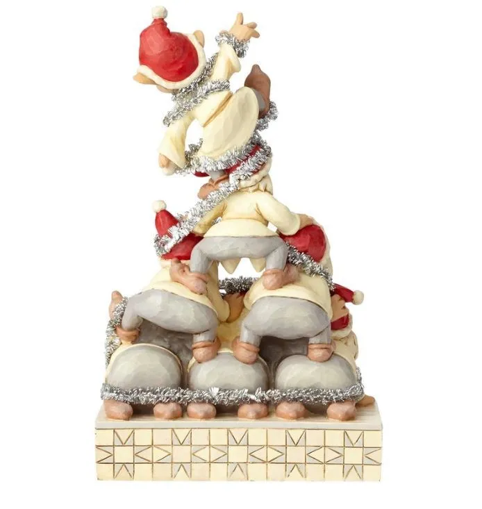 Snow White’s seven dwarfs reach new heights in their holiday decorating! Dressed in white robes and Santa caps, they form a garland-covered pyramid as Dopey tops the festive pile. This stone resin figurine is handcrafted and hand-painted.