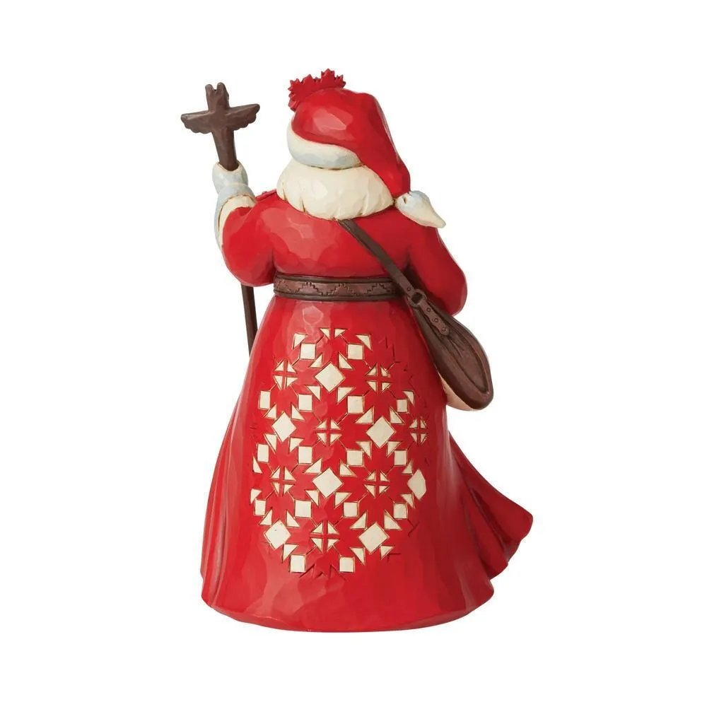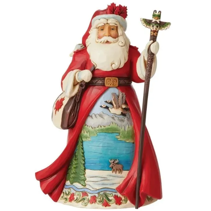 Jim Shore's Christmas Around the World collection celebrates seasonal customs near and far. This unique Santa figurine commemorates Canada at Christmastime. Carrying a maple leaf satchel, Santa's cloak reveals a stunning northern nature scene.