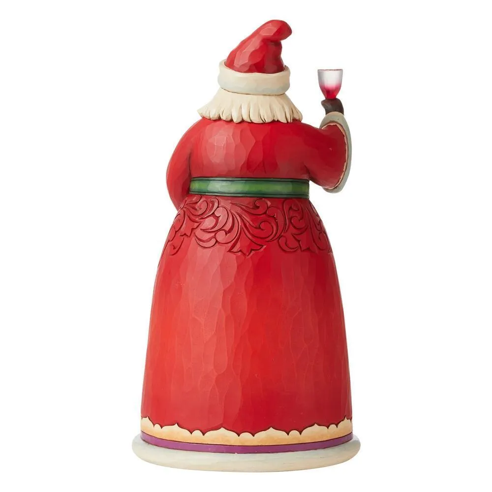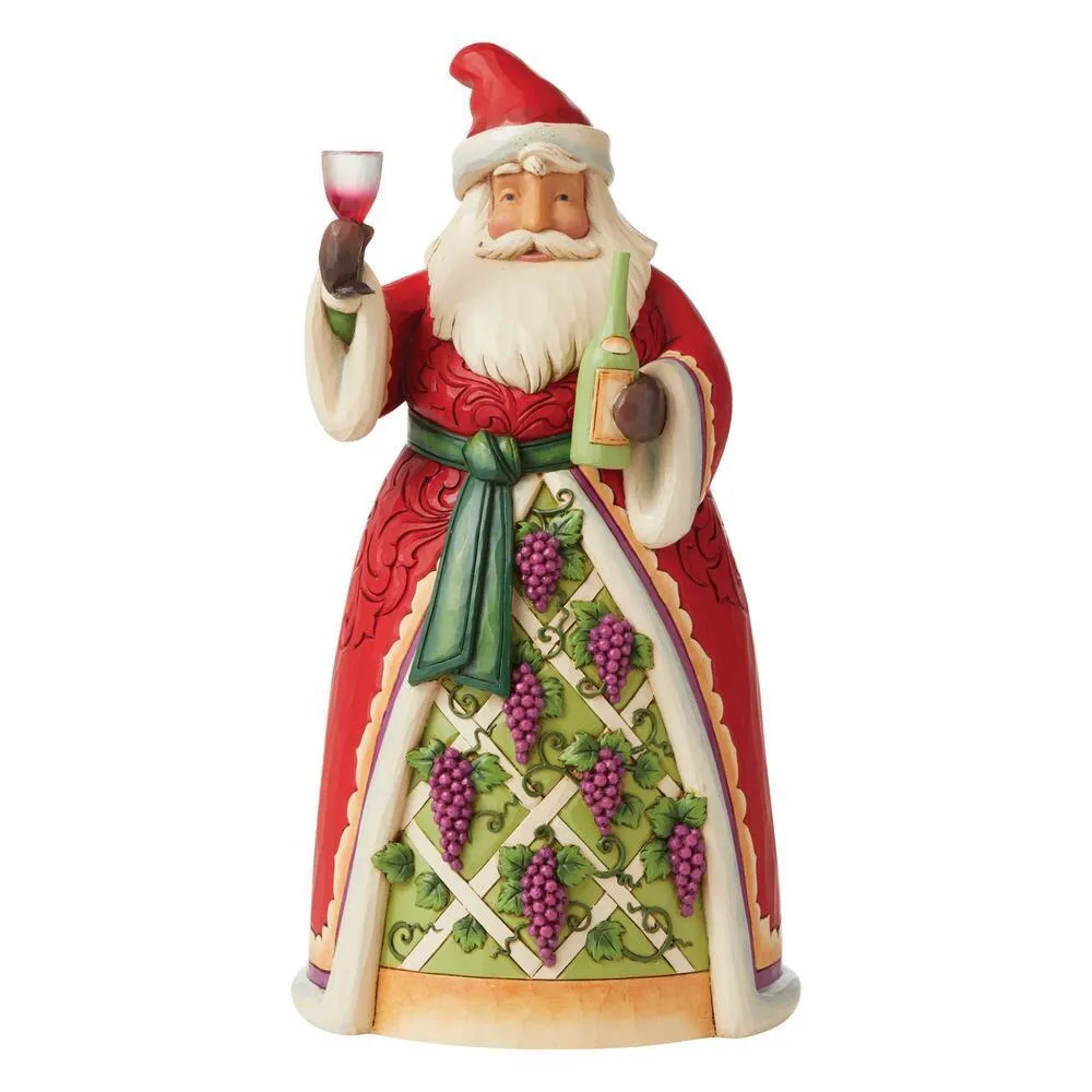 Santa is officially off the clock on Christmas day. Celebrating another year, Santa shares a bottle of vintage holiday cheer. With a cloak garnished in grapes, this Jim Shore Santa is in the spirit of holiday cheer.