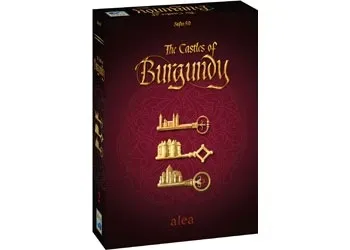 The Castles of Burgundy is set in the Burgundy region of High Medieval France. Each player takes on the role of an aristocrat, originally controlling a small princedom. While playing, they aim to build settlements and powerful castles, practice trade along the river, exploit silver mines, and use the knowledge of travelers. The game is about players taking settlement tiles from the game board and placing them into their princedom, which is represented by the player board. Every tile has a function that starts when the tile is placed in the princedom. The princedom itself consists of several regions, each of which demands its own type of settlement tile. The game is played in five phases, each consisting of five rounds. Each phase begins with the game board stocked with settlement tiles and goods tiles. At the beginning of each round, all players roll their two dice, and the player who is currently first in turn order rolls a goods placement die. A goods tile is made available on the game board according to the roll of the goods die. During each round, players take their turns in the current turn order. During their turn, a player may perform any two of the four possible types of actions: Take a settlement tile from the numbered depot on the game board corresponding to one of their dice and place it in the staging area on their player board. Place a settlement tile from the staging area of their player board to a space on their player board with a number matching one of their dice in the corresponding region for the type of tile and adjacent to a previously placed settlement tile. Deliver goods with a number matching one of their dice. Take worker tokens that allow the player to adjust the roll of their dice. In addition to these actions, a player may buy a settlement tile from the central depot on the game board and place it in the staging area on their player board. If an action triggers the awarding of victory points, those points are immediately recorded. Each settlement tile offers a benefit: additional actions, additional money, advancement on the turn order track, more goods tiles, die roll adjustment or victory points. Bonus victory points are awarded for filling a region with settlement tiles. The game ends when the last player finishes their turn of the fifth round of the fifth phase. Victory points are awarded for unused money and workers and for undelivered goods. Bonus victory points from certain settlement tiles are awarded at the end of the game. The player with the most victory points wins.