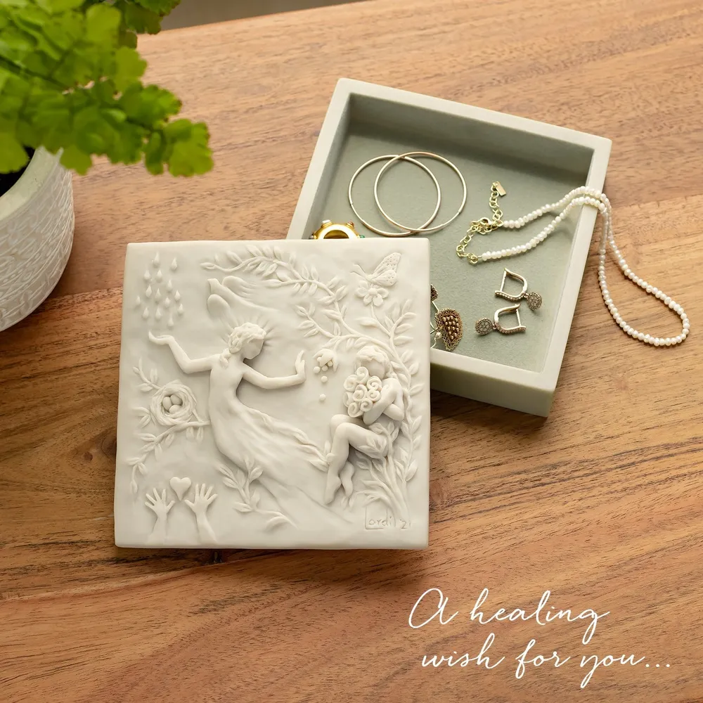 A beautiful and functional box for jewelry and keepsakes. Lid is carved with healing elements of nature and figural imagery. Bottom of box has a velvety soft finish. Detached lid, with sentiment printed on back, can be hung on wall as a decorative plaque.
