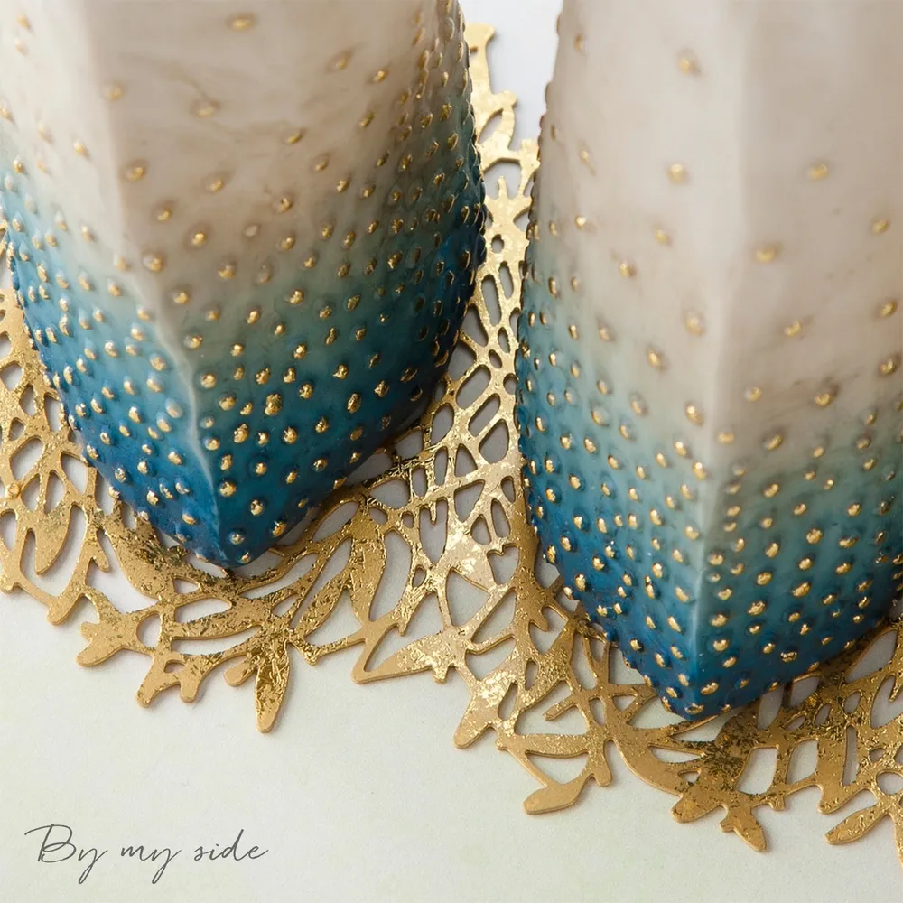 This piece features a large sculpture of 3 tall women standing next to each other, attached to a base of metal and gold-leaf. The figures are in cream dresses, with their skirts embellished in blue ombré and gold-leaf dots at the base. The arms and hands of the figures are around each other.