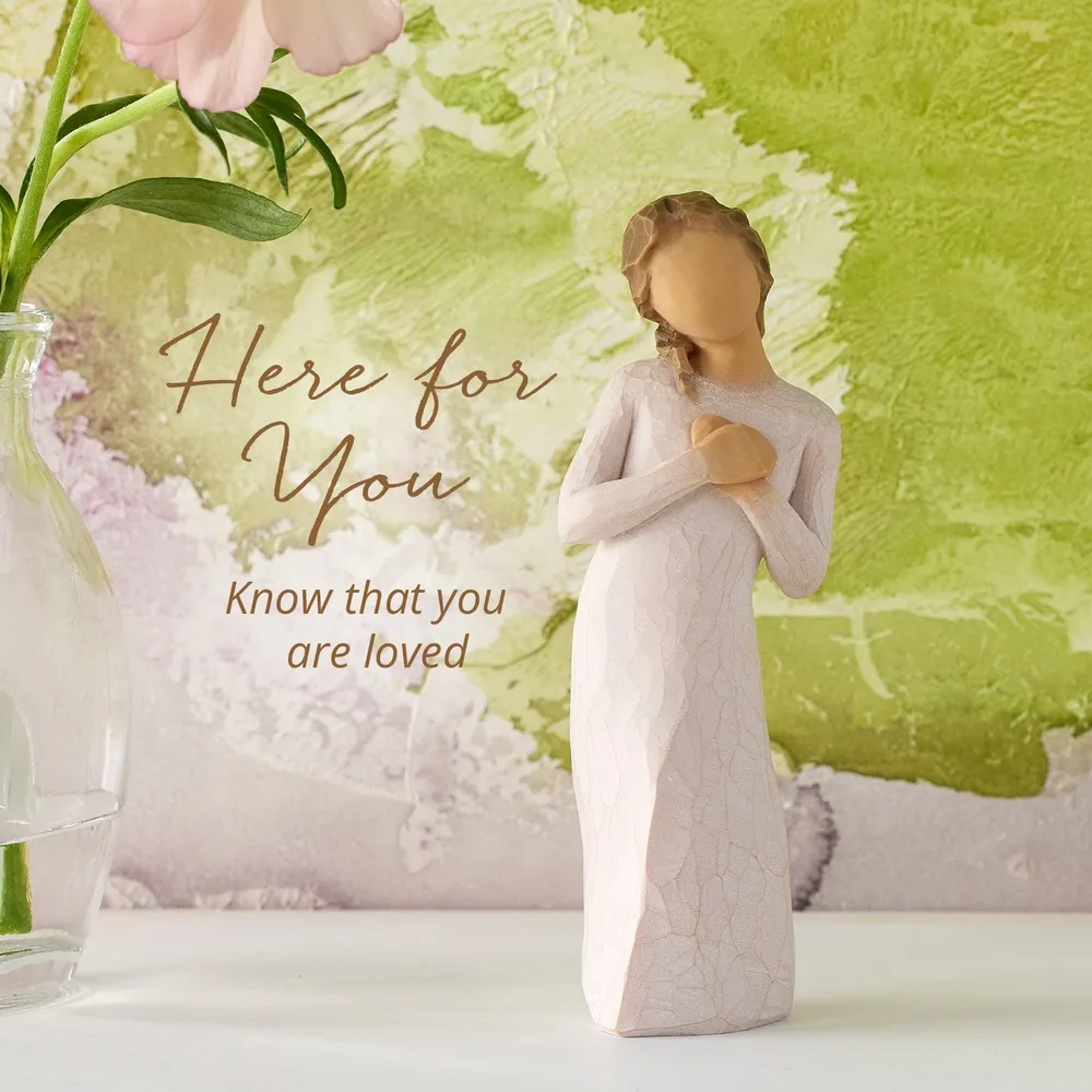 Willow Tree figurines are renowned for their unique ability to express feelings without the use of words. Each piece is hand-carved and painted, ensuring that every figurine is a one-of-a-kind work of art. The Here For You figurine captures the essence of companionship and understanding, making it a thoughtful gift for friends, family, or anyone who needs a reminder that they are not alone.