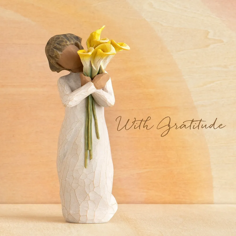 Bright yellow calla lilies, representing thankfulness and appreciation, fill the arms of this figure just as gratitude fills the heart of one who practices it. Being filled with gratitude warms us like a sunny, golden day. What a wonderful way to acknowledge those who surround us with encouragement, care, love and joy… with gratitude.